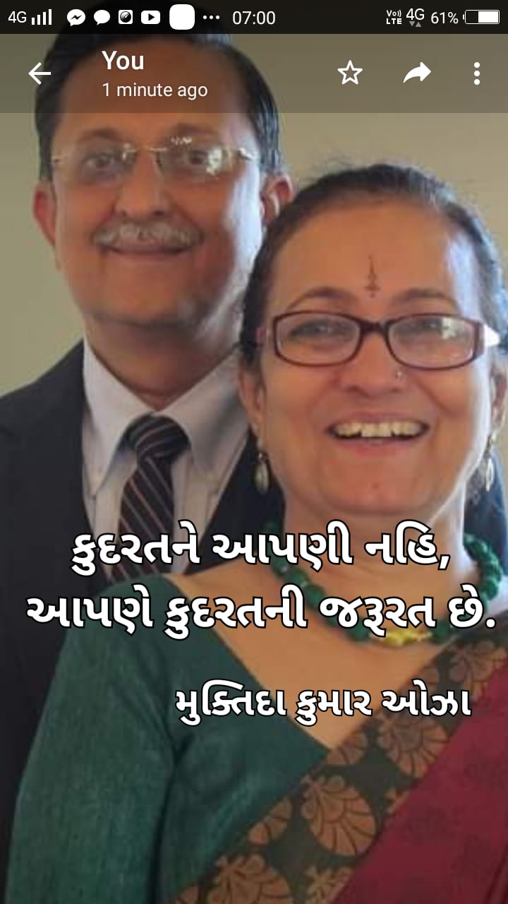 ઓ!બસ,મજા!જિંદગી…… સરળ છે!જીવીએ છીએ.માણીએ છીએ હા,અંગત નથી,અલાયદા,એકલાંસદા,માનીએતોમતવાલીએમુખડું મલકે,માણિગરને જોતી,વરમાળા પરોવતી,એ આવે છે,આવે છેરે.એ.થનગનતી થનગનતી,મનમાં મહાલતી ‘વહાલથી’.એ જ તો છે જિંદગી,મારી જિંદગી!!!મુક્તિદા કુમાર ઓઝા